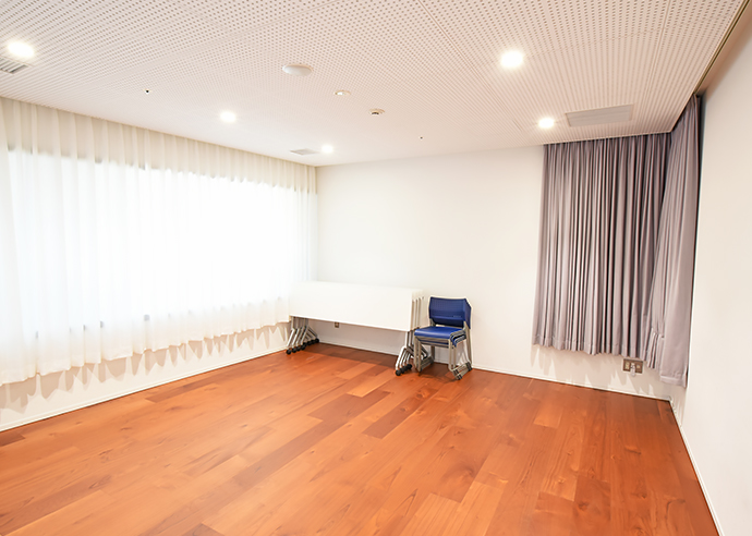 面積 17㎡ 最大利用人数 18名(会議利用最大12名) 扉 二重扉×1か所 特徴 防音室フローリング仕上げ 利用例 会議・楽器練習・舞踊 -